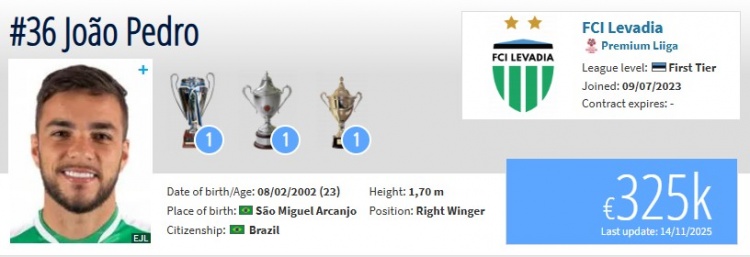 若昂·佩德罗现年23岁,主要司职右边锋,2023年加盟塔林利瓦迪亚队,一共为球队出战89次,贡献22球17次助攻,德转当前身价32.5万欧。